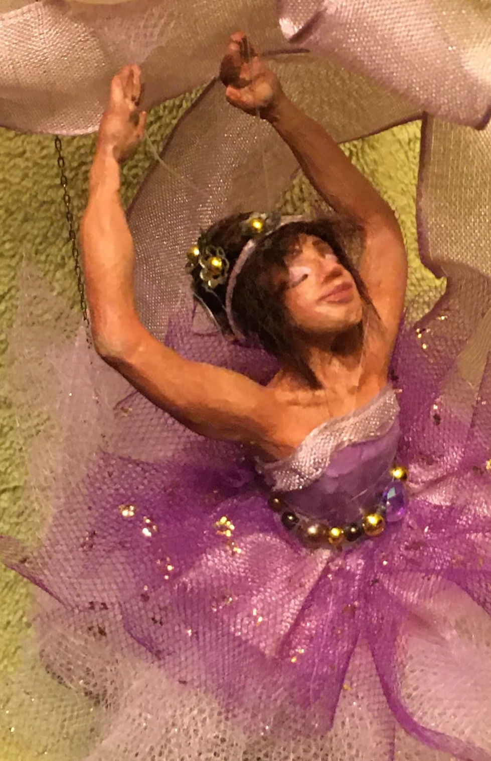 These mixed-media fairy sculptures are inspired by archetypes and stories I grew up with as a little girl, such as princesses, or characters from ballets or fairytales. Many incorporate wings or attire inspired by certain butterfly or moth species and aspects of their native habitat or the surrounding culture of countries in which they are commonly found. I use a mixture of clay, fabric, paint, doll hair, paper-mache, and faux florals in these hanging mobile pieces.